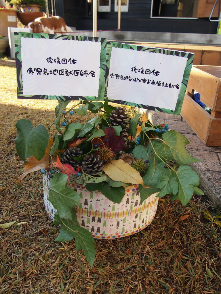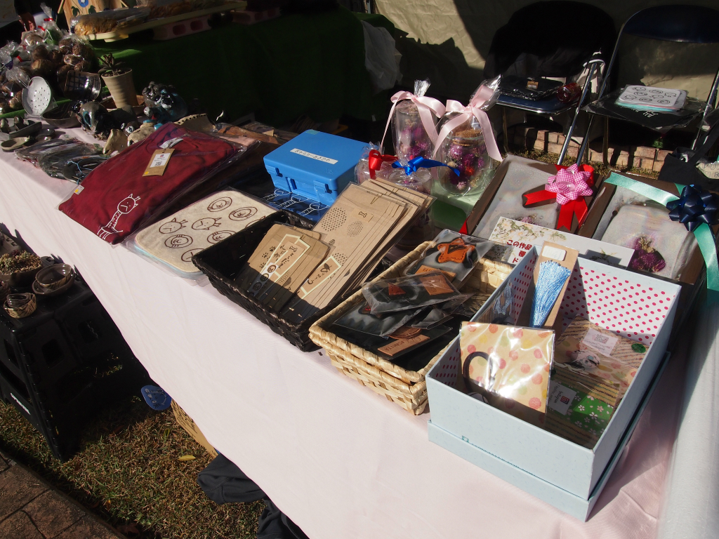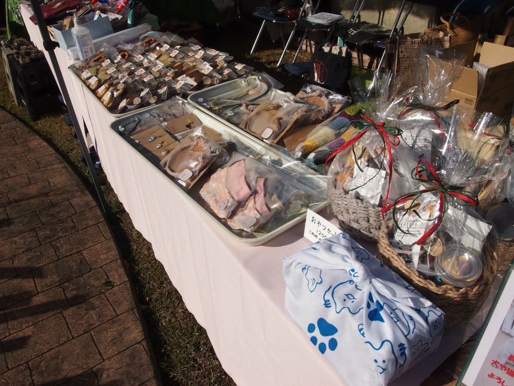まずは、手前から有限会社まうるーる(鹿児島市のアニマルセラピー&犬猫グッズ販売)のブース。犬猫のグッズやお菓子(クッキーやコーヒーなど)がたくさん並び、目が楽しくなると好評でした。