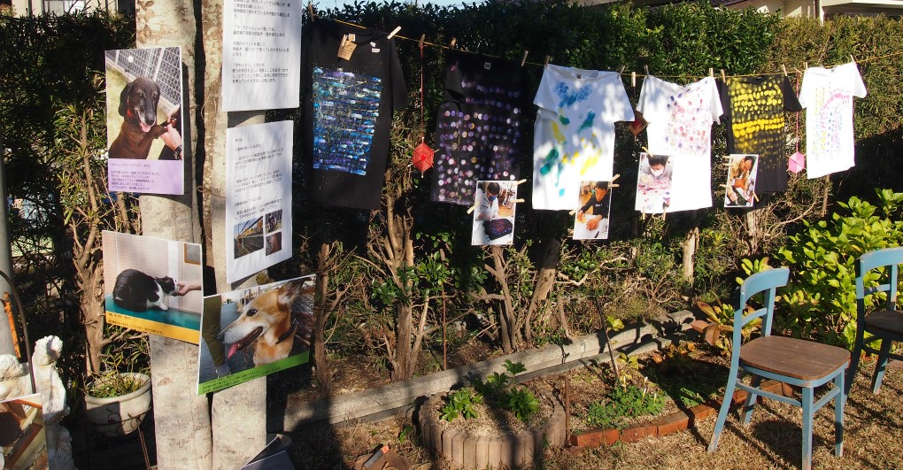 Tシャツを使った作品群と「供血犬や供血猫の紹介コーナー」も。