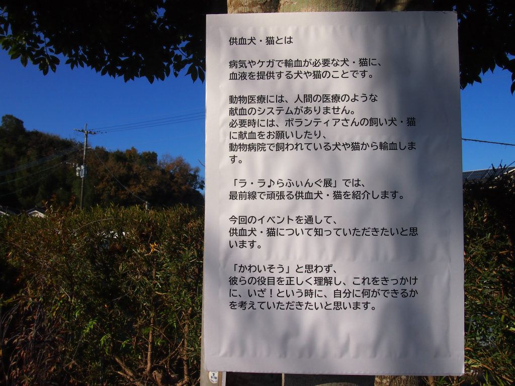 今回の「ラ・ラ♪らふぃんぐ展」では、鹿児島市内の動物病院に快く協力して頂き、供血犬や供血猫の写真を撮影しました。動物病院でいつも頑張っている犬猫たちにも、クリスマスプレゼントとしてちゅ~る(みんな大好き♪)を贈りたいと考えています。