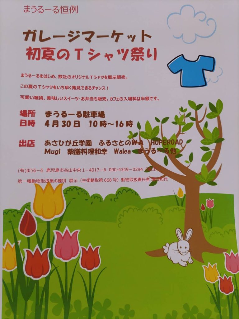 2023年4月30日開催♬ まうるーるガレージマーケット~初夏のTシャツ祭り~ お知らせ 2023.04.07 2023年4月30日に、まうるーるにて『ガレージマーケット~初夏のTシャツ祭り~』を開催します♪ まうるーるをはじめ、数社のオリジナルTシャツを展示販売。 可愛い雑貨、美味しいスイーツ、お弁当も販売します。また、カフェの入場料は半額です。 詳しくは、↓のチラシもご覧ください。