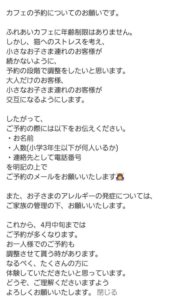 カフェのご予約についてのお願いです。次のような理由の為、ご予約の際にはーー