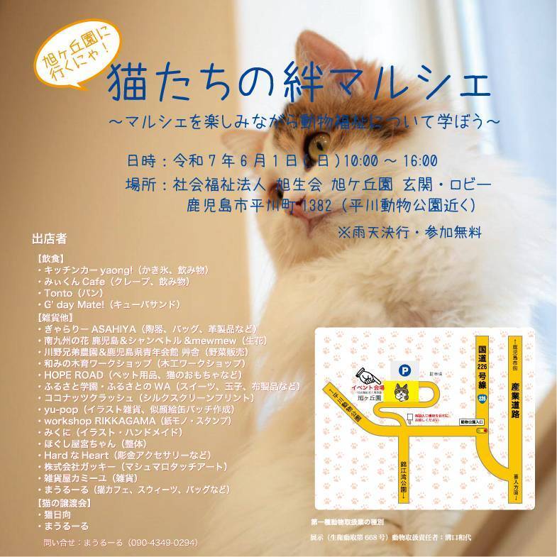 (令和7年6月1日・日曜日)猫たちの絆マルシェを開催します お知らせ 2025.05.13 令和7年6月1日(日)10時~16時に『猫たちの絆マルシェ』を開催します。雨天決行、参加無料です。 ★会場:社会福祉法人 旭生会 旭ヶ丘園玄関・ロビー (鹿児島市平川町1382・平川動物園近く) 出店者はチラシをご覧ください。お問い合わせは、まうるーる(090-4349-0294)へお寄せ下さい。