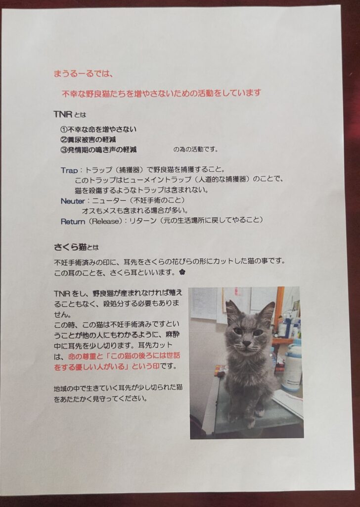 また、「ペットボトルキャップを回収 ⇒ 高齢者施設さんや障がい者施設さんで色分け ⇒ プラスチック会社さんで粉砕~加工 ⇒ まうるーるや協賛店さんで商品として販売 ⇒ 各地域で獣医さんとも連携してTNR活動」という流れで、多くの方に協力・応援していただけています。ありがとうございます。