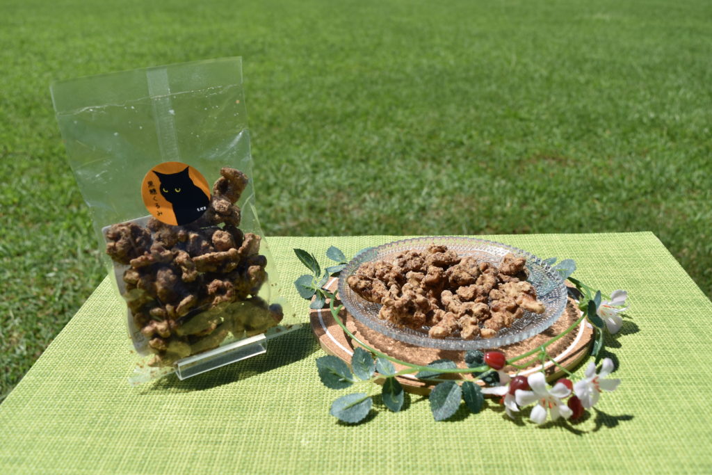 物販スペースでは、「猫さんクッキー」「猫さんコーヒー」「黒糖クルミのりんかけ」「犬猫のカバン」を販売しています。